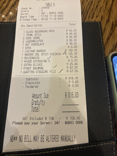 The food was exceptional. Everyone in our group was impressed by the deliciously prepared and beautifully presented Chicken Schnitzel, Basil Aglio Olio Pasta, Hamburger with chips, and Nachos. I ordered the Arrabiata, and every bite was fresh, perfectly cooked, and bursting with flavour. The generous portions made the meal even more satisfying.
