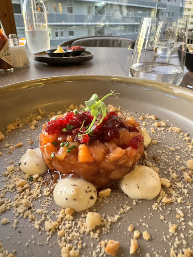 Food: The restaurant offers a Mediterranean-style menu, with a focus on wood-fired cooking. We love seafood and thought this would be a great place to try it. We started with oysters - my favorite with Asian dressing - the oysters were fresh and briny. Another starter was the crab and avocado cocktail with corn sorbet - I found the flavors a bit unbalanced, with the delicate crab being overwhelmed by the starchy corn flavor, which should have been more of a background element. The Teriyaki Salmon was stunning - the salmon was fresh and fatty, and the dressing was perfectly balanced, with a great variety of textures - a strong dish. For mains we had the lobster tail and the grilled langoustines. The lobster tail with caviar and shallot butter was perfectly cooked, and the shallot garnish was an unexpected delight. The langoustines - wow! So soft, buttery and tender - we came back a second time just for these.