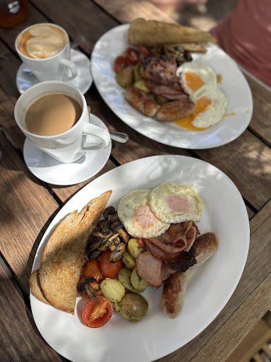 She considerately seated me at a table where I'd be out of the draught while still being able to enjoy the garden and deli views. I added an Americano with warm milk beside, and set about savoring the delicious and hearty breakfast before me.