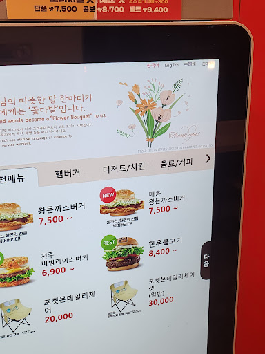 Like lotteria there are many first-class hambergers. Also, the interior was as colorful as lotteria. The disaduantage is that the restaurant is Lotteria. Delivery was also possible like Lotteria. I 'll recmmand mozzarellla in the berger bacon. It's price is...