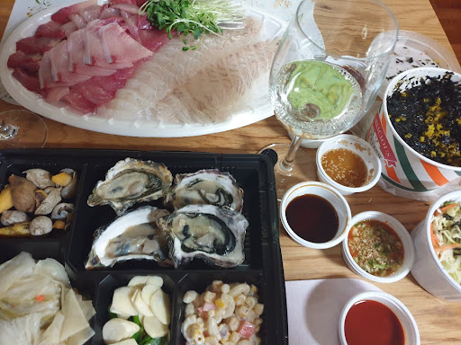 코로나인데도 불구하고, 식당에 손님이 엄청 많았어요. 저는 그래도 불안해서 포장을 해왔는데, 정말 신선하고, 가격도 아주 착했어요. 양이 많지 않은 사람들이라면 4명이서 먹어도 충분한 양이었어요. 요즘 방어철이라 방어랑 광어회를 시켰구요. 가격은 5만원대입니다. 화랑이라는 정종을 한 병시켜서 와인잔에 따라 마셨어요. 맛이 부드럽고, 괜찮았어요. 사이드에 굴이랑 소라, 주먹밥, 초밥이 나왔어요. 주먹밥도 아주 맛있었어요. 가성비도 좋은 곳이고, 특히 신선한 회가 아주 저렴한 편이라서 자주 포장하는 식당입니다. 적극 추천하고 싶은 식당이에요 아산에 이런 곳이...