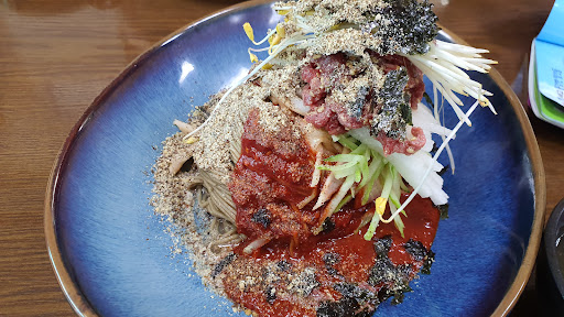 It's a buckwheat noodles restaurant that serves everything from buckwheat noodles to buckwheat crepe. They do have bibimbap with thinly sliced raw beef and veggies and another version of it without the raw beef (veggies only). But, we had bibim noodles and cold noodles, and they tasted quite different from other buckwheat noodles I'ved tried. For a starter, the color was different--they had a tinge of green and a pretty strong bitter aftertaste. Moreover, the bibim noodles were EXTREMELY spicy!