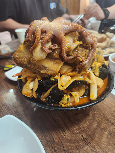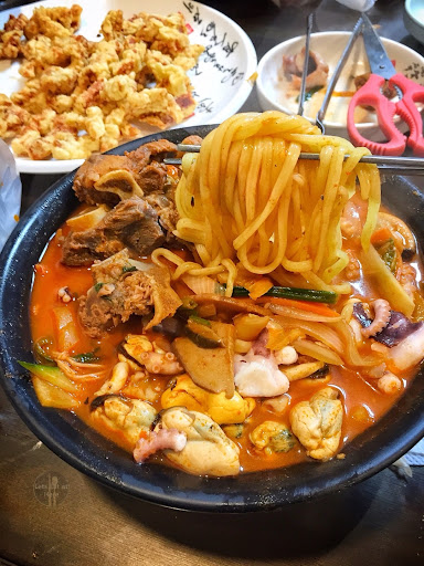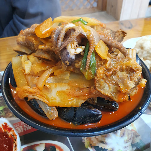 #해물갈비짬뽕 이 짬뽕은 일단 비주얼부터 눈이 갑니다. 솔직히 이런 비주얼로 승부하는 음식점 좋아하지 않는데.. 이 집은 예전부터 끌렸고 위치상 휘팍 놀러 갔을 때 알아둬도 좋을 곳이라 주문해 먹어봤어요. 많은 양의 해물에 끓여둔 갈비를 미리 조리해둔 짬뽕국물 (볶음밥에 딸려 나오는 짬뽕국물과 같음)을 넣고 추가 조리한 짬뽕인데.. 제가 개인적으로 이런 묵은 국물 짬뽕을 싫어해서 맛있다는 느낌은 없었습니다. (후레쉬하게 바로 볶아 국물낸 짬뽕을 좋아합니다) 하지만 막대한 홍합의 산과 통낙지 한마리, 푸짐한 갈비살 (조금 질기기는 하지만)은 참 든든한 한끼를 보장합니다. 푹 끓인 (강릉 동화가든 짬뽕순두부와 같은 맥락) 묵은 짬뽕국물 좋아하시는 분들에게는 참 좋은 짬뽕일 듯 하네요.