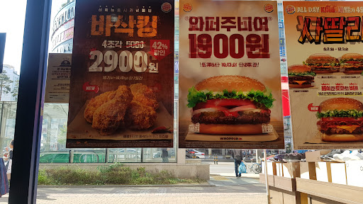 Read more사람들이 비가 오는 오전에도 많음. 앉아서 먹을 수 있는 곳은 8~9개 테이블이 있지만 4인 이하 모임금지로 앉기도 어렵고 2인용 테이블이 많음. 셀프주문용 키오스크 3대와 카운터가 따로 있음. 기네스(기네스 흑맥주 연상) 와퍼를 먹었지만, 번 색깔만 검정이라 특이할 뿐 번도 패티도 얇아지고 오리지널 와퍼와 이전 버거킹의 쥬이시한 맛이 사라져서 맥도널드나 롯데리아와의 차이가 없어졌다. 먹으면서...