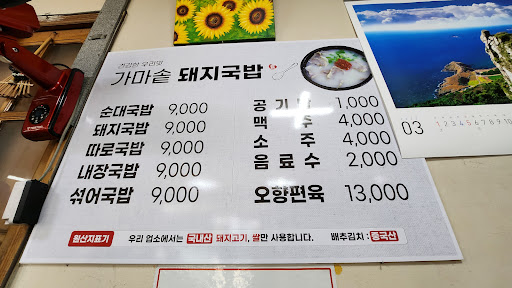 유동인구도 없을것같은 이런곳에 9천원이나 하는 국밥을 누가먹으러오지? 라고 생각했지만 웬걸 9천원이 아깝지않은 국밥이었습니다. 순대국밥은 진짜 창자에 여러가지재료를 갈아넣은 제대로된 순대가 듬뿍 들었습니다. 식감은 찹쌀순대와 유사합니다. 돼지국밥은 여러부위가 함께 들어있는 뒷고기같은 스타일인데 여러가지 식감의 고기가 섞여서 다양한 씹는맛이 있습니다. 상당한양의 새우젓이 같이나와서 이걸 다 엊다쓰냐 했는데 국물간이 거의 안돼서 취향에따라 간을 맞춰먹기 좋습니다. 저도 약간 짜게먹는편이라 조금씩 넣어가며 간맞췃더니 그많은 새우젓이 거의다들어갔습니다. 양도 푸짐하고 건더기도 듬뿍 들어서 비싼가격 납득됩니다. 누가 여기까지 비싼국밥 먹으러 오나 싶지만 어떻게알고오는지 식사시간엔...