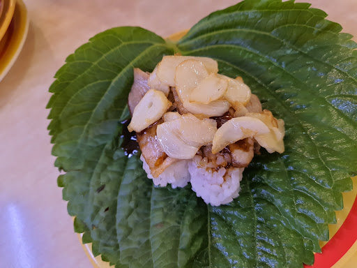 마늘이 잔뜩 올려진 삼겹살 초밥도 있습니다. 깻잎을 같이 주는거는 좀 신박하긴 했는데, 실제로 먹어보니 약간 불편하네요. 깻잎 1개에 초밥이 2개라, 이걸 한번에 쌈으로 먹으려니 좀 커가지구 살짝 불편했습니다. 1개를 먹고 남은 1개만 쌈을 먹는게 딱 맞던데, 흠 이럴거면 깻잎을 2장 주면 좋았을것 같기도 하네요.