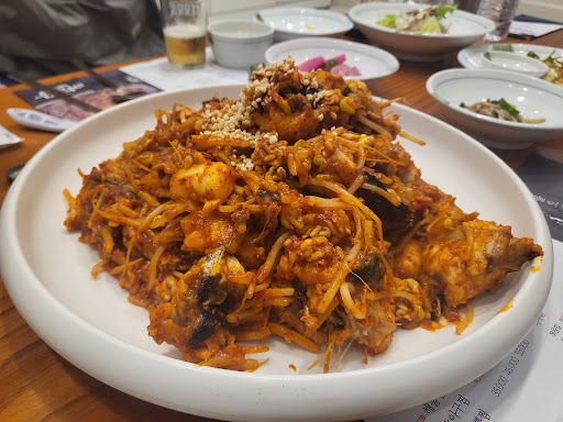 약간 매운맛도 많이 맵지않고 맛있네요. 맛으로보면 별네개지만 서비스는 별한개입니다 서비스를 중시하는 저는 다시는 안걸거같습니다 저녁식사로 방문했는데 식사하고있는 테블과 붙어있는 테이블로 안내를해주더군요 그방엔 치워지지않은 빈테이블 네개가있었고 그래서 좀떨어진곳 치워달랬더니 바빠서 치울시간이 없다고 그냥 앉으라더군요 그렇게 않아서 음식을 주문햇고 음식이나와서 사진을 찍으려는데 짜증을내시더군요 빨리찍으라고 자기가 빨리 잘라주고 다른테이블 가야한다고 바쁘다고 결국 일행이 가위와집게받고 알아서 자를테니 가보라고 보냈습니다. 어럽게 찍은 사진한장입니다. 식사시간엔 가지마세요 손님대접못받습니다. 식사시간...