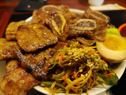 저랑 동생은 La갈비에 양념삼겹 같이 나오는 덮밥을 주문했는데 파채와 양념으로 잘 구워진 고기, 느끼함을 잡아줄 와사비와 밥과 밥위에 후리카게 뿌려져있었고, 고기 양념이 밥에 배겨서 좋았습니다.