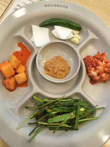 As a cruise ship musician, I mostly visit Japan and South Korea, so I naturally compare my experiences in these two countries. When it comes to food culture, one difference I noticed is that in South Korea, I don't have to pay for side dishes. As you can see in this restaurant, the side dishes were free, and the main pork soup was incredibly flavorful and rich. However, in Japan, I used to pay for extra side dishes whenever I went to a restaurant.