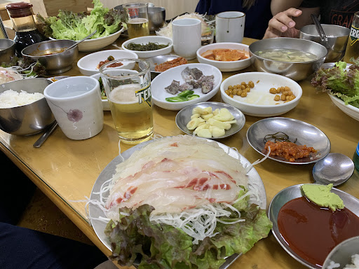 Went to the popular myungmul sashimi place. Sashimi is served per person unlike any other korean hwe places. We ordered the “35k won per person” meals and the highlight was the soup!!! This is not your everyday free soup, for me the soup was more delish than sashimi. Apparently they refill it for you for free if you ask ( i didnt know)
