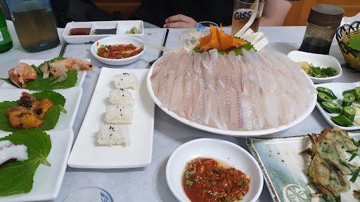 Texture of hwe, raw fish is nice. I heard they prepare differently. They cure the raw fish and slice then vertically. Side dishes are decent. Lots of varieties. Loved the spicy squid salad. You can order soup in the end with extra money I think It was 3,000won. Heard clear soup taste better. I had spicy soup and it was nice as well.