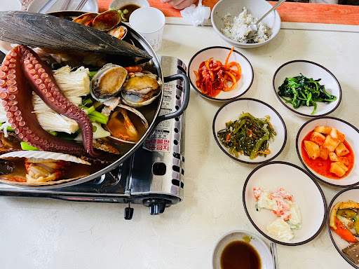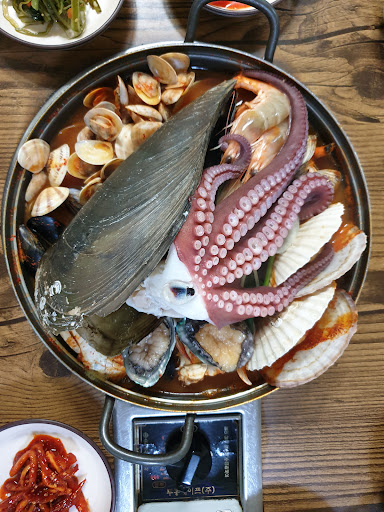 "중"자부터 문어와 가리비가 추가로 들어가는데 2인이서 먹기에 충분한 양이라 참고하시면 될것 같아요. 해물은 주로 조개류가 위주인데요 해감이 잘 되어 있어 씹히는 모래라든지 이물질은 하나도 없었습니다. 그리고 해산물 모두 신선한 느낌이었구요. 찬은 여러가지 나오지는 않는데 도라지인지 더덕 무침이 너무 맛있었습니다.