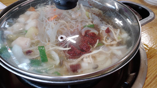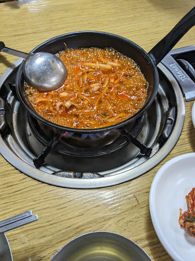 注文後すぐに鍋とご飯が運ばれて、店員さんがテーブルのコンロで調理してくれます。 おかずのキムチやナムルをつまみながら飲んで待つと、5分ほどで食べられます。 見た目ほど辛くはなく、エビやタコがプリプリで柔らかく美味しいです。ご飯に乗せて混ぜながら食べてもおいしい。 卵は1人1個まで無料で、追加は1個500ウォン。セルフで焼けます。 一人飯にも丁度いい量で、お会計は16000ウォンくらいだったかな。 地元の空気を感じながら美味しいご飯を食べられ...
