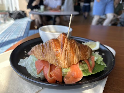 A few things: The view from the cafe is amazing. It’s in a prime location and has large windows throughout. The food is great. I had soup with a salmon croissant, and a hot latte. The latte tasted great, can taste the coffee but definitely in a good way. Not too weak, not too bitter. The sandwich was good. It’s a bit sweet, they put in honey mustard and it’s a bit overpowering, but overall a really solid breakfast. The soup was mushroom soup, was thick and good quality. We also ordered a vanilla latte, my wife found it a bit sweet for her, but that’s not the restaurants fault. Great vibe, would be a nice place to work. They seem to have power plugs near the windows so you can plug in your laptop.