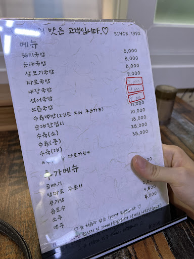 메뉴판. since 1992 적혀있으니 30년이 넘은 가게. 주류회사에서 제작한 메뉴판이 아니고 나름 깔끔하게 디자인 됐다. 일러스트는 사장님이신 듯? 1번 메뉴인 돼지국밥(9천 원)과 소주(4천 원) 주문.