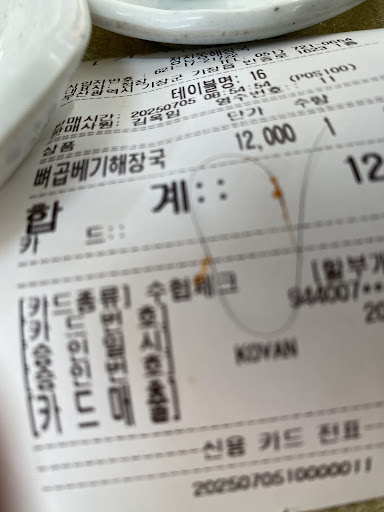 Read more입구 들어서자마자 느낀점 그닥 깔끔해보이지 않는다. 와이프 선지해장국, 나는 뼈다귀해장국을 시켰다. 둘다 별로다. 아니 맛없다. 선지해장국은 콩나물국에 선지만 넣은 듯.. 국물이 너무 밍숭맹숭하다. 뼈해장국도 고기가 퍽퍽하고 양이적다. 큰조각하나에 아주작은조각 하나.. 더군다나 뼈에 붙은 고기도 적다. 밥도 질어서 나는 반공기 먹고 와이프는...