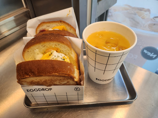 We ordered a sandwich set with scrambled eggs that came with a glass of orange juice, and another sandwich with bacon and eggs. I have to say, these sandwiches were incredibly delicious! The scrambled eggs were so creamy, and the fillings were indeed overflowing, making it a delightful mess to eat.