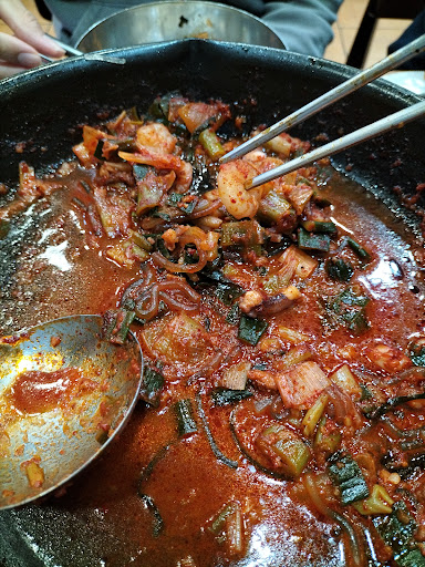 Ate here for lunch on a Monday in April. Got seated immediately - very welcoming staff. There is almost no English on the front of the restaurant - don't let this put you off! There is an English menu available, and the staff were helpful despite our almost total lack of Korean. You have basically three options for main dish - Octopus stir fry, Octopus and shrimp stir fry or Octopus, shrimp and tripe stir fry. We went with the Octopus and shrimp. There are other toppings you can add - we added some glass noodles. Be aware that you also get rice (unless you're a solo diner, then you need to pay for the rice (1000 won)). You also select the spice level - we went for the lowest (out of three) and it was a lovely low level of spice that we all enjoyed. The whole table eats the same dish, so you'll need to collaborate with the rest of your group! The dish is cooked on a gas ring at your table - the staff take control of this and stir the food and adjust the flame as necessary - wait until they remove the lid, then you know it is ready to eat! At the end, take the order slip up to the till...