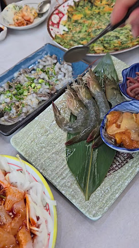 Read more예약필수! 이른저녁부터 손님 많아요. 저희는 식사 2시간짜리 작은 룸에 있었는데 여러사람들이 같이 식사하는 작은테이블들이 있는곳은 바다 뷰 였어요. 인당 45000원에 음식들이 한상 쫙차려지고 열심히 맛있게 먹고있음 또 음식들이 들어오는데.. 살아있는 싱싱한 생새우 회(팔딱 뛰어서 깜짝 놀람..) 전복찜.가리비.문어숙회.낙지탕탕이.새우찜.게불.멍게.간장게장.회...등등 다 싱싱하고 맛있었어요.이곳은 마지막에 밥과 매운탕이 나오지않고 홍합탕과 전복죽으로 마무리하는데 더 좋았고 맛있었어요. 이곳은 다른 음식점들과 달리 리필하기가 쫌.. 부침개와 전복죽을 하나더 부탁했었는데 주방에 물어보고 가능하면 주시겠다고 하더라구요. 그리고 사장님이신지 아닌지 모르겠지만 음식 차려주시면서 얘기해주시는 나이드신분께서 다 반말로 말씀하시던데 컨셉이신지.... @ㅡ@ ;; 아무튼 완전...