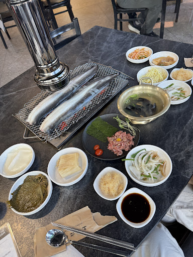 Everything was so delicious! Two male waiters cooked the eel for us on the grill and did it very professionally. I used my translator app, Papago, to tell one of them (he was a bit more stocky) that he was professional and we appreciated him cooking for us. He smiled very heartily and said thank you in Korean. When the eel was done cooking, he brought over a handout of recommendations of how to eat the eel deliciously. There were 4 recommendations on it. For example, eel + perilla leaf, white kimchi, ginger salad, special soy sauce, and wild ginseng root. The slimmer male waiter later returned to help us trim off the burnt edges of our eel. So attentive! The seafood ramen was also flavorful and packed with seafood!
