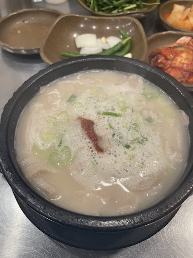 I can understand why this place has received good reviews. However, in my experience, there are many other pork soup restaurants that I find more flavorful, though I won’t mention them here, as it wouldn’t be appropriate. The food here is certainly tasty, but I feel the reputation of this being the "best pork soup restaurant" is a bit overrated. It seems to be advertised as a must-visit spot due to its popularity among travelers. The servers seemed quite unfriendly, possibly because they were busy, and the place felt very busy. It was also uncomfortable to have tables so close together that I was sitting right next to strangers. At the pork soup places I’m familiar with, the food is good, and you don’t have to share a table with other customers. The broth here tends to be on the heavier side, and the side dishes provided are the usual basics: kimchi, radish kimchi, chives, onions, and peppers. Especially during lunch and dinner hours, there’s often a long wait, and I’m not sure if it’s worth waiting that long. It might be a good idea to explore other pork soup restaurants as well.