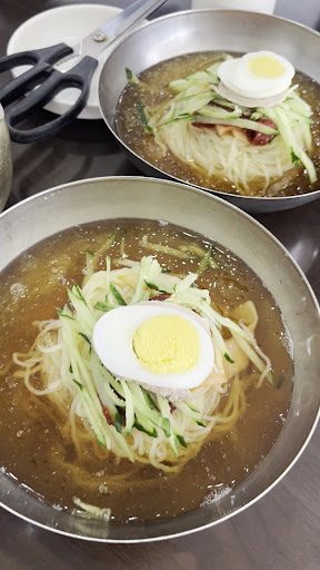 釜山鎮駅から徒歩5分くらいにある ミルミョンのお店 ミルミョンとは釜山名物の 小麦を使った料理です。 ▫️ムルミルニョン( 비빔밀면) 7000ウォン キムチの入った辛いミルミョンもあって 美味しいそうだけど まずは定番の普通のミルミョンを頼みました😋 お店のお兄さんが日本語で対応してくれて とてもフレンドリー🥰 最初に調味料を使ってない 出汁のスープを出してもらえます。 この出汁がやかんで出てきて、熱くて美味しい🥰 ミルミョンもすぐ提供されて スープに氷が入ってて 冷たいラーメンのよう。 一緒に出てくるハサミで 麺を切って食べるそうですが 私はそのまま食べました😋 あっさりしてて美味しかったです🥰 オープン時間の少し前に行ったのですが 中に入れてくれて 後からお客さんもぼちぼち来ていたので お昼時はとても賑わうと思います。 ごちそうさまでした☺️
