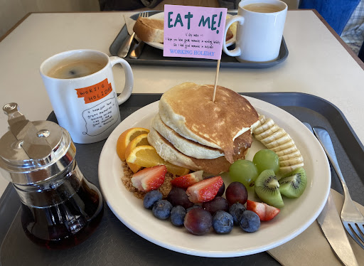 Read moreThere are very few places in Busan to have breakfast that open before 11:00am but Working Holiday is open at 9:00 am daily. I had the 3 pancake platter with fruit (it normally comes with ice cream and cream but because I am lactose intolerant they replaced those two items with extra fruit). My husband had scrambled eggs, brioche toast, bacon and avacado, and Americano coffee; everything was so delicious and fresh. The staff was so friendly, helpful and accommodating. Absolutely the best place for breakfast in Busan! We will...