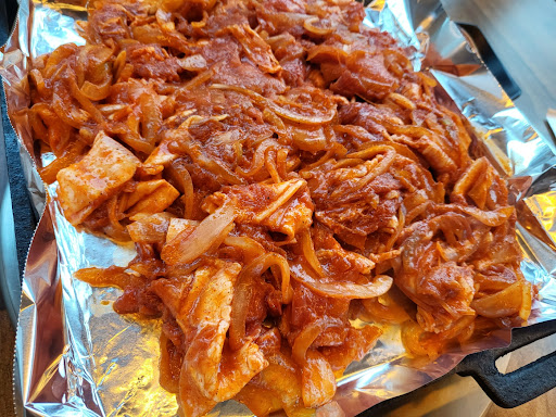 이 골목에 비슷한 류의 고깃집이 몇개 있음. 그래서 이 동네 제일 북적북적한 골목인듯. 가족중에 한명은 어릴때부터 먹어봤다는 곳이라서 온김에 들려봄. 1~2년에 한번씩은 들린다고 함. 제육볶음인데 고기가 얇고 양파가 많음. 그리고 껍데기까지 붙어있어서 식감이 좋음. 무난하게 먹을 수 있는 맛. 양이 많지는 않지만 적당하고 볶음밥까지 먹으면 딱 맞음. 볶음밥 먹으려면 호일이 타지 않아야 하기 때문에 불조절 잘해야 함. 이곳에 오면 반드시 먹어야 하는건 아니지만 시골 마을에 이렇게 고깃집 골목이 있다는 것 만으로도 감사한 일인듯. 그리고 가격도 서울에 비하면 착하고 부담 없이 한 번씩 들려서 먹을만 한 듯. 1인분 8천원. 사진은 4인분. 볶음밥은 1인분 2천원. 4인가족이 고기집에서 된장까지해서...