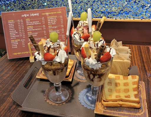 ‘사랑이 그린 세상’is one of my favorite cafe. I did search on the best parfait in마산,and this place came up. I like its cozy atmosphere inside. Also all the staffs always greet customers with a smile. I recommend this place because it’s a good date course. And all you can eat as much waffle bread as you want. I recommend ‘chocolate parfait’. It’s 6700won and I think its sweet and cruspy because it has cereal in it. The only weakness of this cafe is hard to find a cafe because it’s...