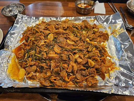 Read moreCook the pork in the broth to render out the fat, then cook it like bacon. Add the garlic, then the pa kimchi and some sauce and cook it for several more minutes and it's a good meal. Fun atmosphere. The basic fare attracts a surprisingly huge crowd. Go if you want to be...