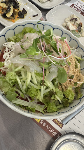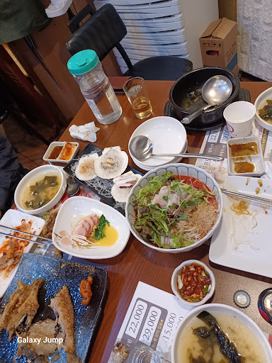 Read more청주에서 물회 맛있다고 소개받은 푸른도횟집! 신랑 하고 같이 와 기본 물회로 시켰어요~ 면 하나 밥하나 하고 공기밥 하나 추가하려고 하니 밥은 그냥 주신다고… 양도 푸짐하고 맛있어서 완전 만족♡ 회 처음에 야채랑 간장, 초장 찍어먹다가 면 말아서 다같이 후루룩~!! 밥도 말아먹고 냠냠 물회에는 면이 더 잘 어울리네용 ㅋㅋ꙼̈ㅋ̆̎ㅋ̊̈