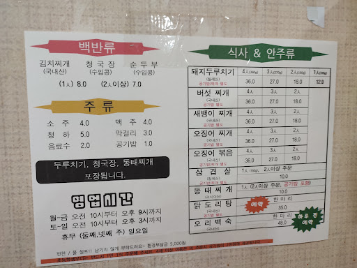 ๊ทผ 20 ์ฌ๋ ๋์ ์ฒญ๊ตญ์ฅ์ด ์๊ฐ๋ ๋๋ฉด ๋ ๋ค๋ฆฌ๋ ๊ณณ์ ๋๋ค. ๋ฌด์์ฑ, ์ฝฉ๋๋ฌผ, ๊ณ๋์ฐ, ๋ฌต ๋ฑ์ ํญ์ ๊ณ ์ ๋ ๋ฐ์ฐฌ์ด๋ฉฐ ๊ทธ ์ธ ์๋๊ฐ์ง๋ ๋ณ๋์ด ์์ต๋๋ค. ์ ํ๋ฐ์์ ์ง์ ์ํ๋ ๋ฐ์ฐฌ์ ๋๊ทธ๋ ์ ์์ ํ๊บผ๋ฒ์ ๋ด์์์, ์ํผ์ ๋ด๊ธด ๋ฐฅ์ ๋ฐ์ฐฌ๊ณผ ์ฒญ๊ตญ์ฅ๊ณผ ํจ๊ป ์ฑ์ฑ ๋น๋ฒผ ๋จน์ผ๋ฉด ๋ ๋ ํ ํ๋ผ๊ฐ ๋๊ณค ํ์ต๋๋ค.