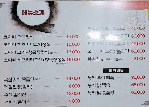 식당의 위치가 찾기 쉽지 않은 곳에 있어서 조금 헤매었음. 방문 전 구글에서 찾아봤던 메뉴판 가격보다 2,000원 정도 인상되어 있었음. 예를 들어 1인분에 15,000원인 것으로 알고 있었던 '코다리 구이 + 청국장 정식'의 가격이 17,000원으로 인상되어 있었음. 코다리 요리는 잘먹는 방법을 몰라선지, 찜이든 구이든 양념과 더불어 숨어있는 잔뼈들을 골라내고 먹느라 즐기기가 쉽지 않음. 청국장도 맛있고 코다리 구이(구이가 아니라 튀김인 것으로 보였음)도 맛있었지만, 가격에 비헤 함께 나오는 반찬들의 종류(갯수)가 다소 빈약함. 결론은 춘천에서 이런 저런 식당들을 다녀보고 있는 나의 개인적인 관점으로는 이곳의 가격이 다소...