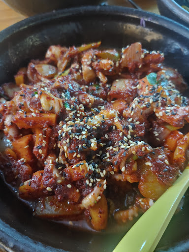 This place has the best spicy octopus! They have 5 levels of spiciness where 1 is the least spicy and 5 is the most. Orders can be placed from 2 servings and you can order plain white rice to be eaten with the spicy octopus dish or you can order white rice with egg (๊ณ๋๋ฐฅ) or white rice with flying fish roe (์๋ฐฅ) and a couple more choices. You mix the spicy octopus together with the rice like bibimbap and eat it. I would recommend level 1 spiciness if you donโt eat...