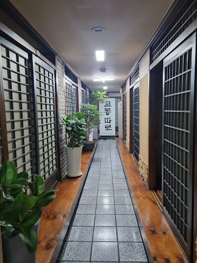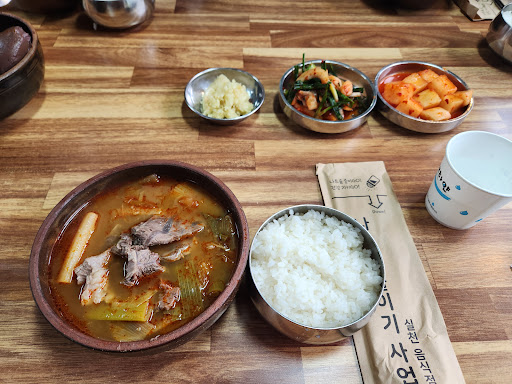 Read moreタロクッパを注文し、およそ7分程で提供されました。 1名で来店したので、クッパ・ご飯・ニンニク・カクテキ・ニラキムチが、黒く塗られた木のお盆ごと配膳です。2名以上であれば料理が大きな銀色のお盆に乗せられ、テーブルには料理のみが配膳されてお盆は下げられていました。 私の場合はソンジ(牛の血を固めた物)は既にクッパに入っていました。調味に使用する塩・胡椒・粉唐辛子・醤油が席に無かったので、他の空席から拝借しました。唐辛子と胡椒を多めに、塩パッパだけでは味がボヤけていましたが、おろしニンニクを入れると引き締まりました。 8cm×6cm×2cm程度のソンジは癖は強くありませんが、それなりに血生臭さを感じるので好き嫌いがはっきりと別れると思います。 クッパにご飯を入れるなら、少し塩を足すと塩梅が良かったです。 クッパに特筆は有りませんが、大邱流のタロクッパを味わうという点では来店の価値はあると思います。 ガラスの入口入ってすぐ左手にメニューがあるので、外からでも価格が分かります。 日曜日の12時台でしたが客入りは2~3割でした。