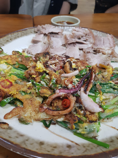 This place is awesome the seafood pancake is delicious. The steamed pork melts in you're mouth . Service is outstanding and friendly. Oh and the many available options to choose from a good selection. If you're got good appetite eat and enjoy all and the side...