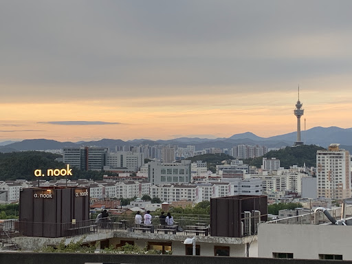 One of four A.Nook cafes in Daegu, their Apsan branch is considered their flagship location. Spread across three floors in a renovated villa, A.Nook Apsan offers stunning views of the city including temple roofs, streets of hanok houses, and the central business district of Namsan-dong located directly North of Apsan Park.