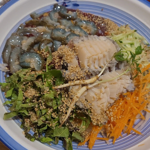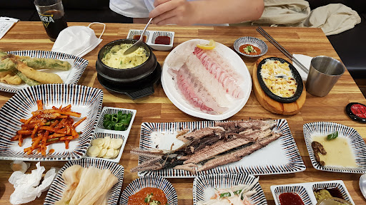 Read more코로나라서 다른 곳은 조용한데 여기만 사람들이 줄을 기다릴 정도로 많았어요. 20분쯤 대기하다가 들어갔습니다. 성인 세명이서 우럭밀치 중자와 물회를 시켰습니다. 우선 기본찬으로 꽁치구이, 계란찜, 치즈콘구이, 튀김, 무침회, 마카로니사라다, 번데기, 쌈, 씻어낸 묵은지가 같이 나와서 종류가 꽤나 많았습니다. 밀치는 씹는 식감이 꽤나 좋았습니다. 묵은지에 회를 싸먹을 때는 묵은지가 조금 짠 느낌이 있어 맛을 헤치긴 했어요. 물회도 여러 회종류와 전복 등이 들어가 양도 많았고 밥도 같이 나왔어요. 매운탕도 가격이 싸고 추가찬도 저렴했어요. 맛도 중간정도는 가는데 가성비가 좋은 물회집이었습니다. 다만 너무 사람이 많아서 복잡하고, 주문하기 힘든 곳이었어요....