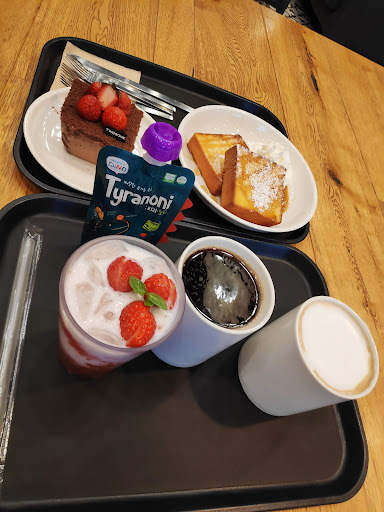 Cafe has spacious parking lot, ground and 2nd floor, tables and chairs on the outside deck. It is quite refreshing when drinking coffee while watching mountain and small river runs.