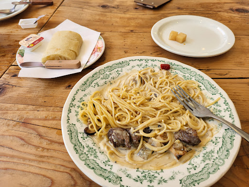 Read moreNot quite good place to bring car. Inside small and busy. Neverthless, vongole and gambas alio olio were and aisan flavored delicious. I will revisit again. Outside small garden is nice to hang around and take picture. Providing free onion tea quite impressive.dishes what I tried were good and finished...