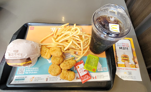 Read more계속 정리정돈 하고, 깔끔하고, 활기찬 신매역 인근 맥도날드입니다. 점심시간에 손님들로 꽉 들어차있고, 어수선해 보이지만 홀에 나와 정리하고 깨끗하게 치우는 것이 좋았습니다. 더블불고기버거 라지세트를 먹었으며, 예상대로 아는 맛입니다. 큰 기대없이 먹었기에 나쁘지 않았습니다. 맥너겟 추가해서 든든하게 먹었습니다. 키오스크에서 테이블 배달 요청을 하니 금방 가져다 주십니다. 언제부턴가 빨대가 없는데 불편한 건 어쩔 수 없나보더군요. 햄버거는...