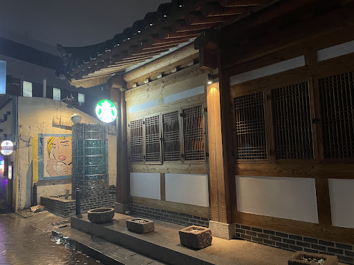 Inside, patrons can enjoy their favorite Starbucks beverages and treats while surrounded by a tasteful fusion of traditional and contemporary elements. The interior decor features traditional Korean furniture, artwork, and pottery, creating a visual tapestry that showcases the country's cultural heritage. The combination of warm lighting, cozy seating, and the soothing aroma of freshly brewed coffee further enhances the overall experience.