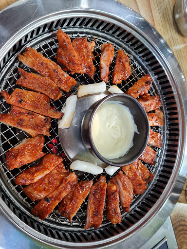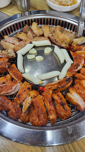 This place specializes in serving 숯불닭갈비(charcoal dak galbi), which is different from normal 닭갈비(dak galbi). I personally prefer the charcoal one, since it gives you a nice smokyflavor compared to the other one. I recommend getting the 양념닭갈비(seasoned dak galbi) with some 공기밥(bowl of rice).