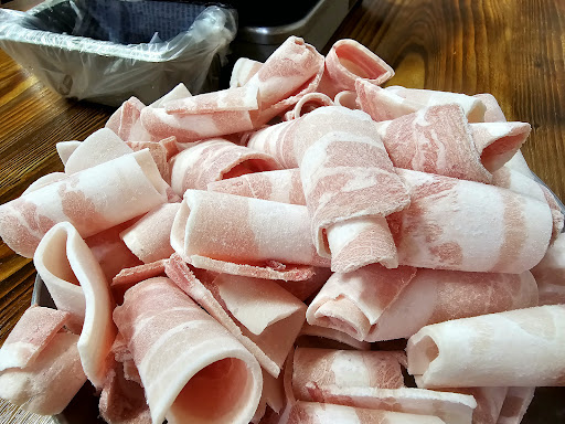 삼겹살은 돌판에 쓱쓱 구워 먹을 수 있는 대패 삼겹살에 비해서는 두껍고, 흔히 보는 냉동삼겹살보다 얇다. 달아 오르는데도 식는데도 시간이 걸리는 돌판에 적절한 두께인지 의문이다. 좀처럼 마음에 드는 익힘 정도가 안 나온다. 한점한점 모두 익힘 정도가 언이븐하다. 난이도가 높다. 오스트리아산이라고 써 있는 삼겹살의 비계는 얇고 부드럽지 않고 살 부분은 팍팍하다.