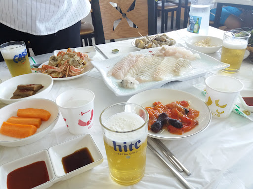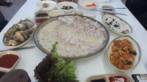회도. 소라도 게도 모두 달아요. 배도 고팠지만 네식구가 먹기에 부족함이 없었어요. 금액은 10 만원 정도로 사장님께서 맞췄어 주시겠다고 하여 믿고 2층으로 올라갔지요. 쌈장에 다진마늘 듬뿍넣어 준비해놓고 음식오기를 기다리고 있었는데 드디어 도착한 회 한상.. 푸짐했어요. 회도, 오징어같은 흰살 생선도,게도, 찐 소라도 진짜 달고 맛있어요. 배가 고팠다고 해도 그렇게 회가 단건 처음이었어요. 모든 음식이 맛났어요. 심지어 매운탕까지 뼈에 붙은 살까지도 싹싹 빨아먹었어요. 근처에 가시면 한번 들러 식사하고 가셔도 괜찮을것 같아요. 젊으신 부부가 운영하시는것 같은데 친절하세요. 설명도 조곤조곤 잘 해주시고 요즘 철인 생선도 싱싱한걸로 추천도 해주시고.. 다녀온지 1달이 되어가는데 자꾸 생각나네요. 근처에가면 또 가서...
