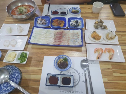 도착해서 미리 주문한 복어회 포함 스페셜세트(20만원) 2세트와 다양한 반찬이 준비되어 있어서 친구들과 정말 즐거운 시간을 보낸 곳. 새우, 가리비, 고동, 문어, 초밥 등이 1인에 하나씩 정성껏 준비해서 주는 곳. 생선구이, 멍게, 소라 숙회 등이 풍성하게 나온 곳. 회는 복어, 참돔 등 다양하지만 풍성한 회를 내주셔서 기분 좋게 먹은 곳. 친구들 모두 즐거워 하는 소리가 끊이지 않은 곳. 마지막에 물회와 매운탕으로 정말 마무리도 끝내줬던 곳. 다음에 갈 일...