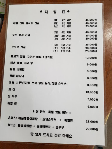 Read more정동진에서 행사를 하고 단체식을 위해 들렀던 식당입니다 홀이 양쪽으로 크게 되어있고 한쪽은 입식 한쪽은 좌식테이블로 구성되어 있네요 우선은 주차장이 잘 준비되어 있어 차가지고 직접 가시는분들은 편리할것 같습니다. 메뉴판을 보시다시피 음식값은 그다지 가성비가 있지는 않습니다만 버스한대이상 단체의 경우에는 선택의 여지가 별로 없는게 여긴 많은 인원이 수용되는 공간과 메뉴가 있어서 이쪽으로 여행가실때는 이곳에서 점심한끼 해결하시는게 용이할듯합니다 음식은 대체로 무난하여 여러사람들의 입맛에 맞는듯하구요 기본반찬들이 셀프로 무한리필이 가능하여 반찬이 푸짐한집으로 기억이 남네요 나가실때는 두부전문답게 두부로 만든 과자를 판매하는데...