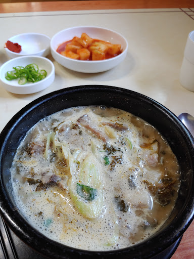 Read more돼지국밥국물에 시래기국을 끓인것같은 비주얼에 깜짝놀랍니다. 처음에는 돼지국밥특유의 누린내가 살짝 느껴져 놀랐습니다만 된장,시래기의 구수한맛과 돼지의 고소한맛이 어우러져서 크리미함에 가까운 맛을 느낄수 있었습니다. 지금생각하면 약간 시금치크림같은 느낌도 나네요. 순대국밥 속 순대는 순대안에 비계가 있는 고기가 있는지 중간에 한번 사각하는 식감과 함께 녹아내리더라구요. 이런국밥은 처음먹어보는데 맛으로도 상위권이라고 생각하고요 여기말고도 비슷한데가 있는지 몰라서 한번 먹어봐야한다고...