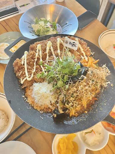 철판돈까스 베이직을 주문했는데 비주얼부터 고급 레스토랑 느낌이었어요. 철판 위에는 바삭한 수제돈까스와 우동야채볶음, 치즈가 함께 올라가 있고, 불로 은은하게 데워 먹는 방식이라 끝까지 따뜻하고 바삭하게 즐길 수 있었어요.
