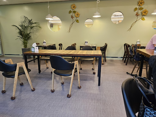 사람이 많고 인기가 많은 장소. 많은 종업원들이 분주하게 서빙하고 빠르게 음식이 준비된다. 건물 앞과 옆에 주차 공간이 있다.
